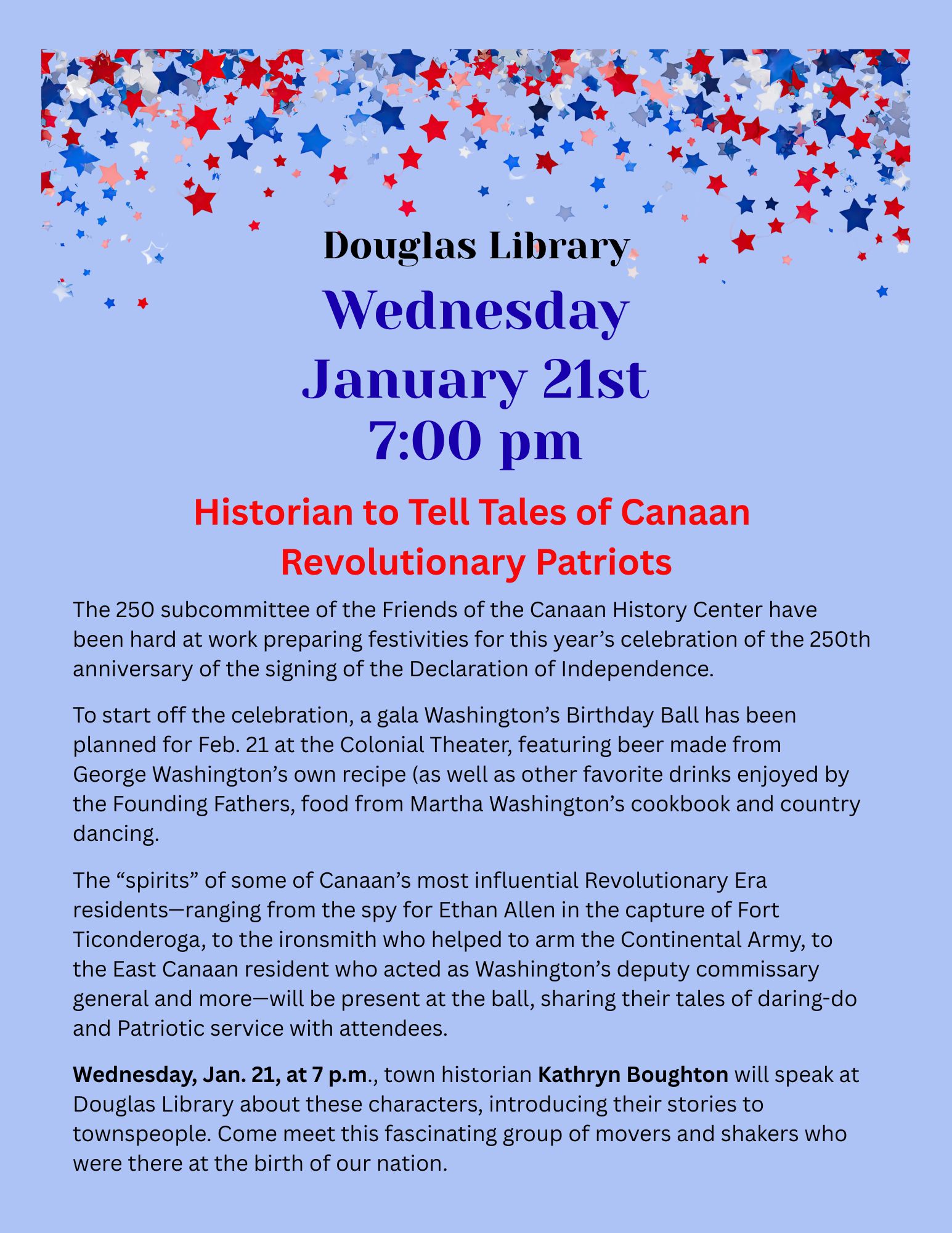 Wednesday, Jan. 21, at 7pm, town historian Kathryn Boughton will speak at the Douglas Library about these characters, introducing their stories to townspeople. Come meet this fascinating group of movers and shakers who were there at the birth of our nation.