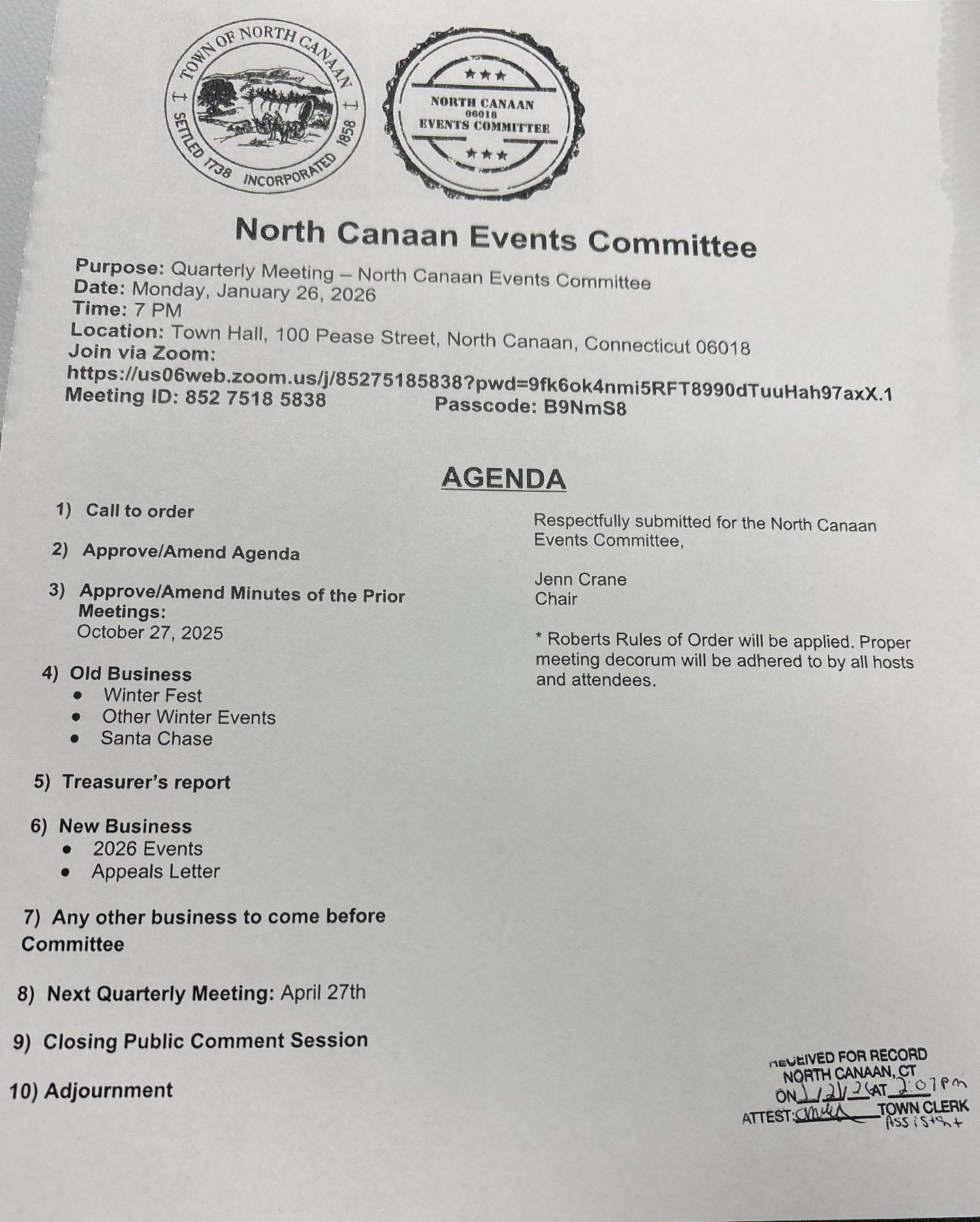 PNZ Public Hearing & Monthly Meeting Agenda
